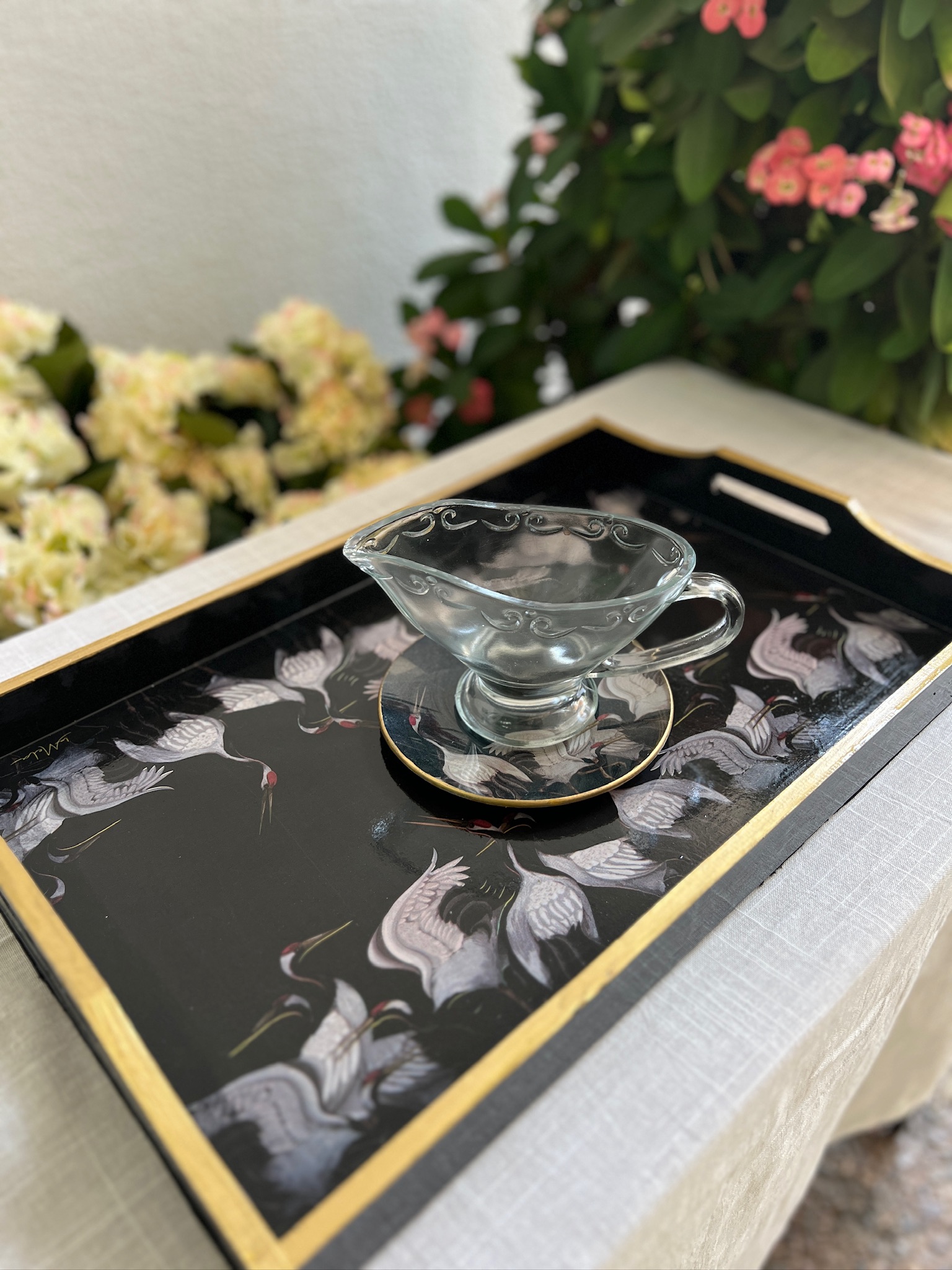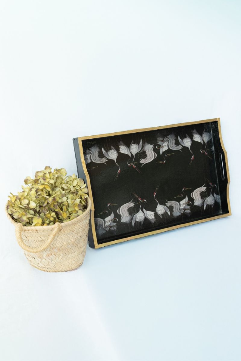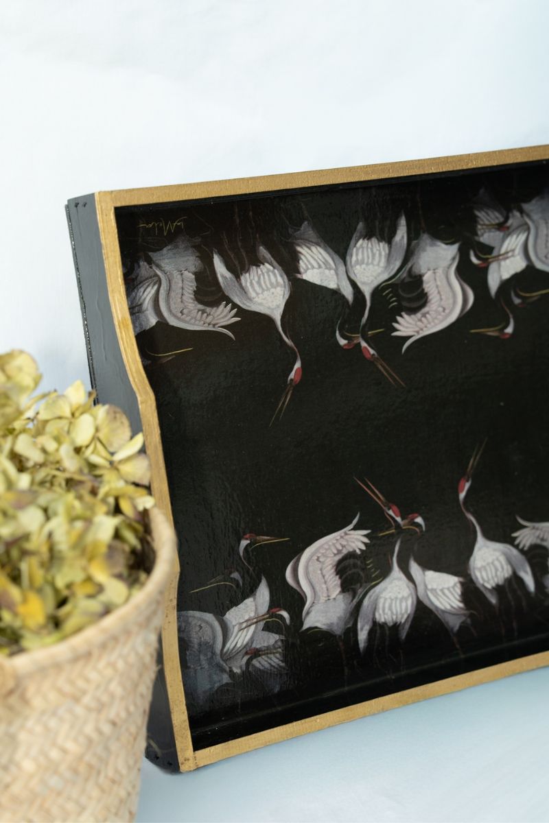 Bandeja de madera de la colección Pájaros Negros. Medida 48,5 x 31 cm. Fondo negro profundo, aves en vuelo y marco dorado: una pieza con presencia, pensada para sumar carácter a cualquier espacio.