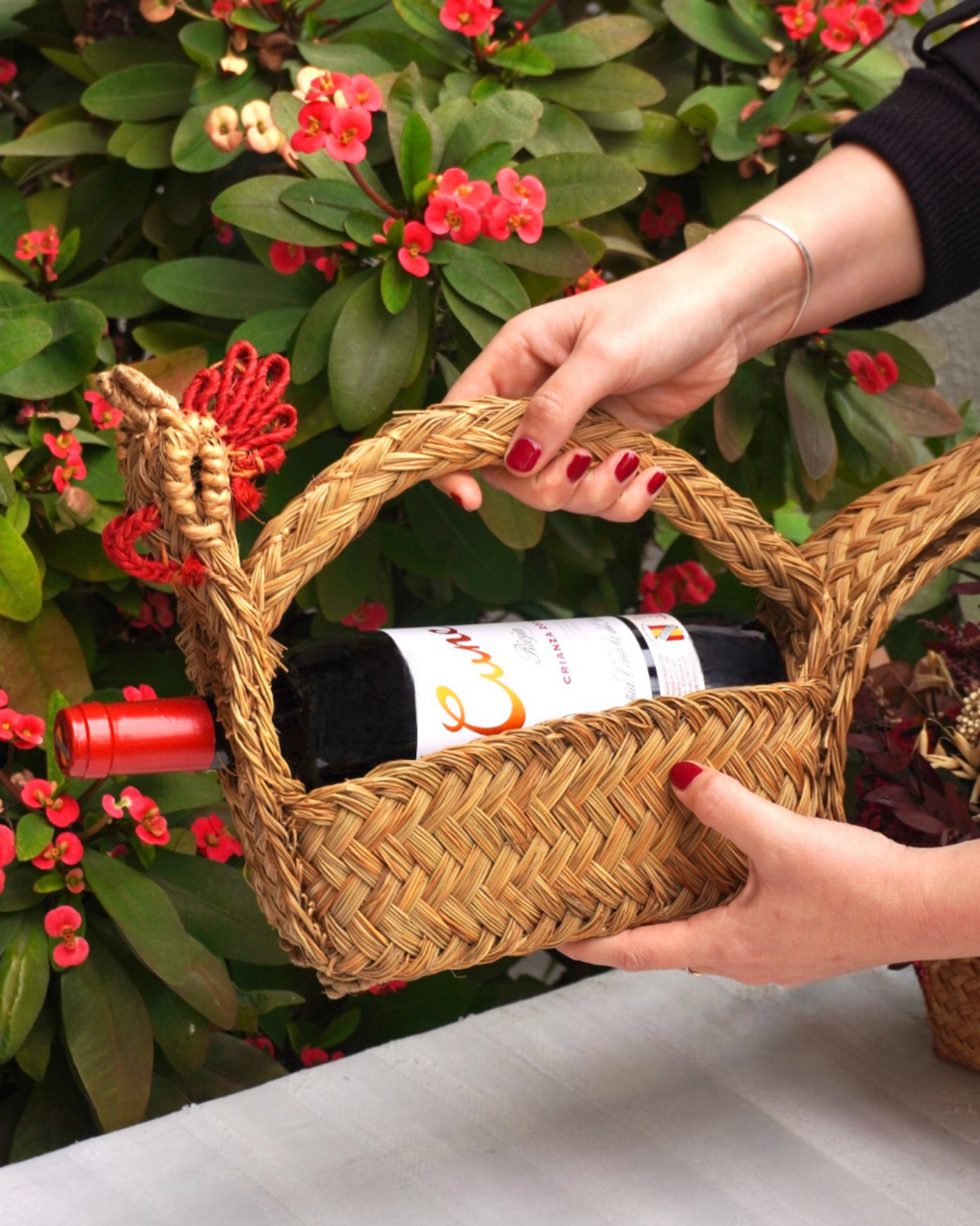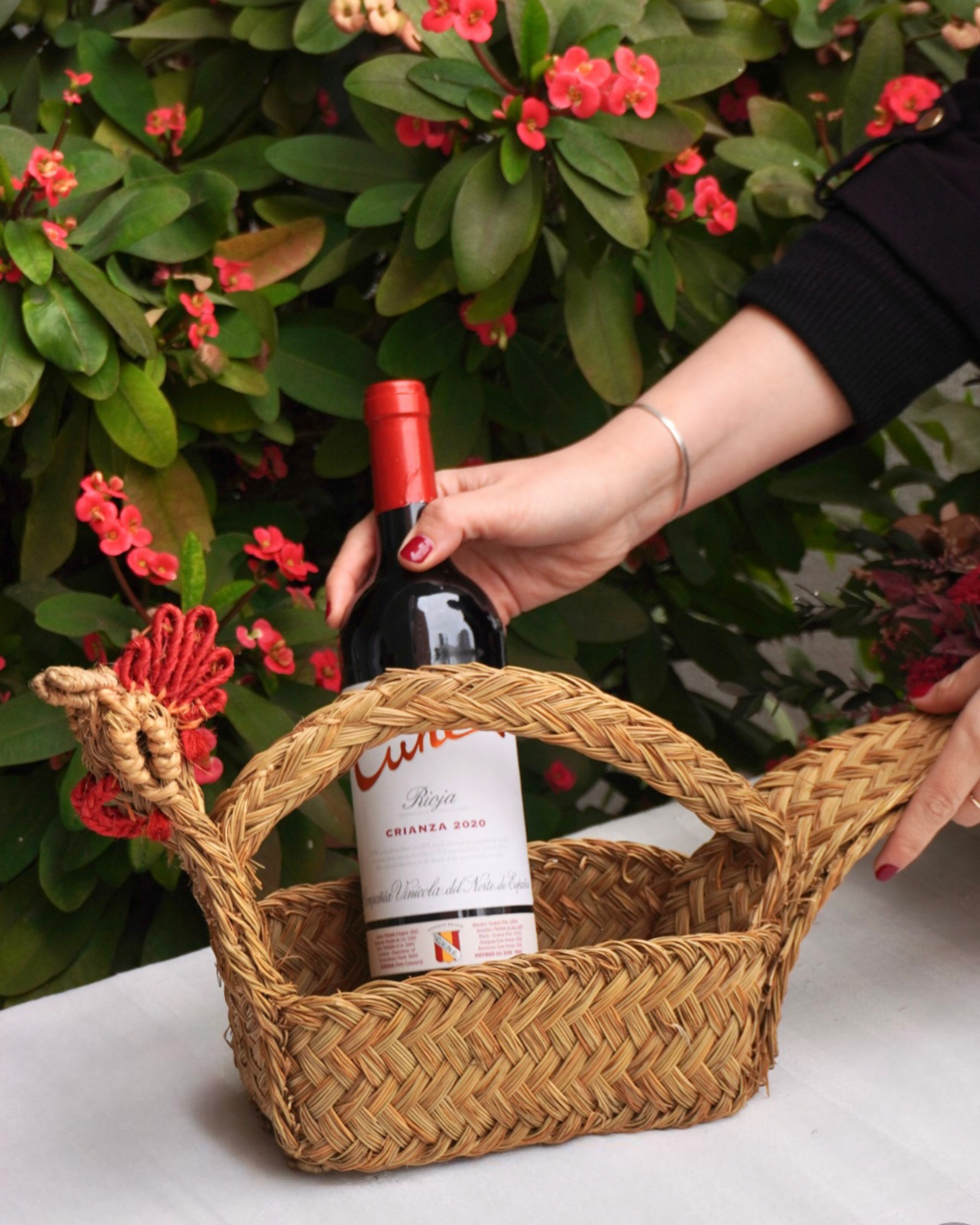 Cesta multifuncional con forma de gallina, tejida en mimbre, perfecta para almacenar botellas o huevos. Hecha a mano en Jaén, con un diseño artesanal y detalles en rojo, combinando funcionalidad y decoración rústica para la cocina o el comedor.