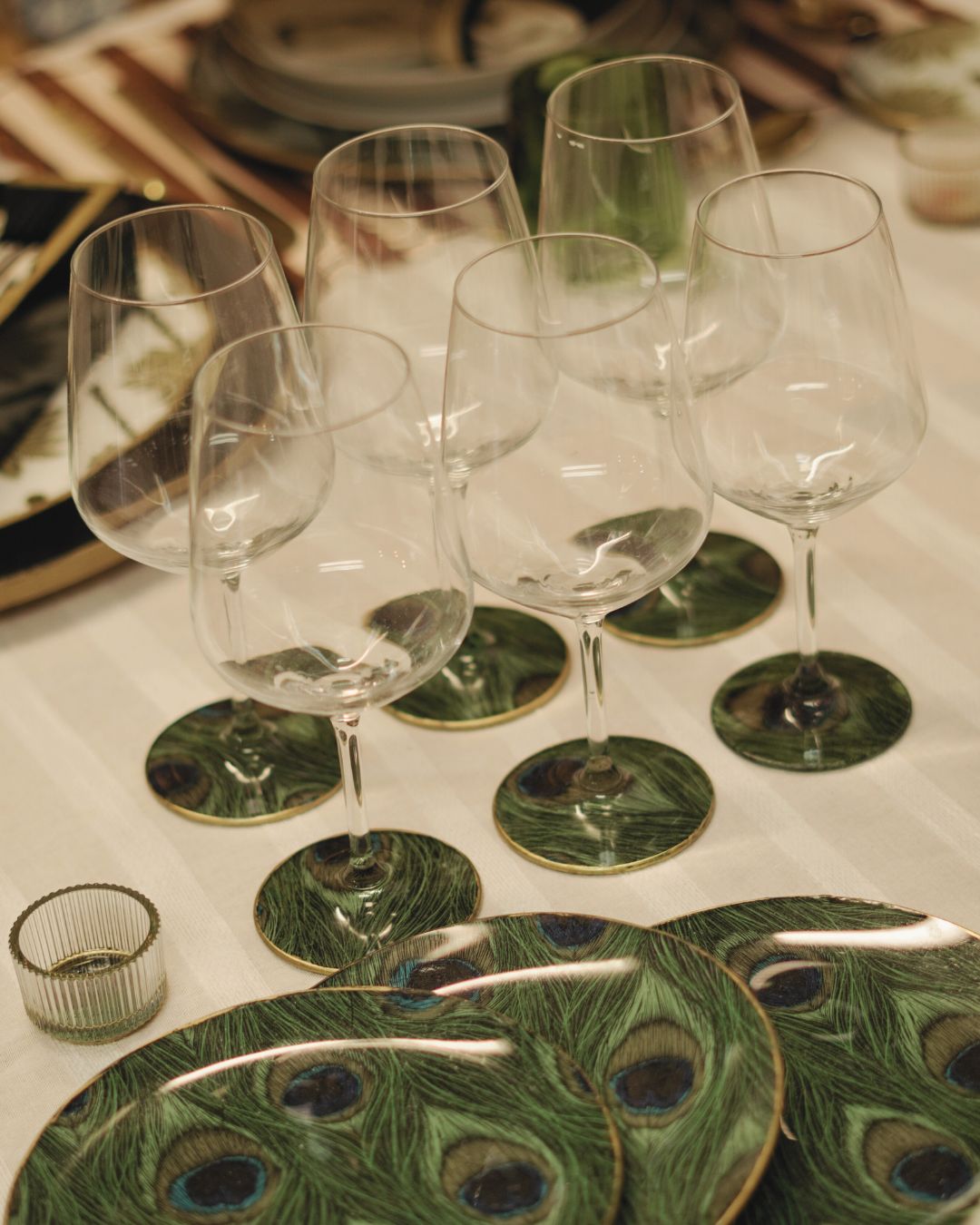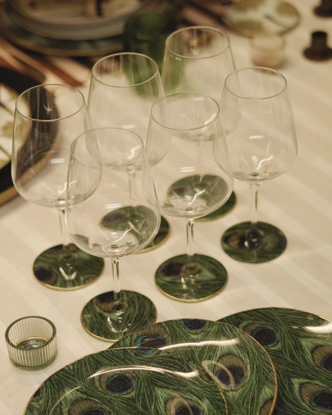 En primer lugar, su forma estilizada realza la experiencia de servir el vino con naturalidad. El cristal, ligero y refinado, aporta brillo y equilibrio visual. Sin embargo, el verdadero protagonismo se encuentra en la base. Allí aparece un sofisticado estampado de de pavo real, aplicado mediante la técnica artesanal del decoupage. Gracias a este proceso manual, cada copa adquiere matices únicos que la diferencian del resto. Como resultado, ninguna pieza es exactamente igual a otra.