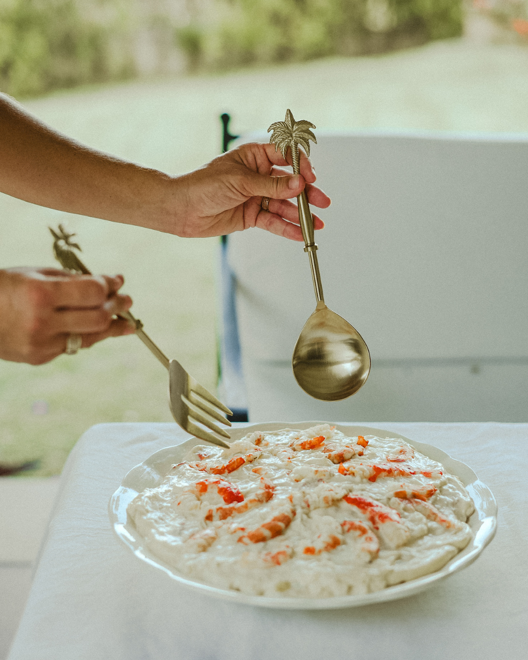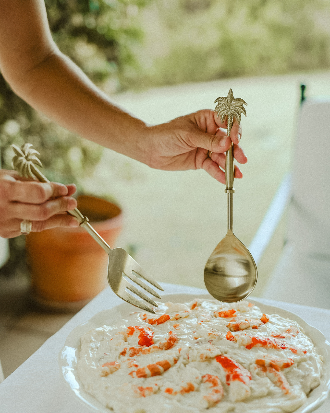 Cada pieza mide entre 25 y 28 cm, una proporción ideal para servir con comodidad platos al centro como ensaladas, pastas o guarniciones. El diseño del mango es el verdadero protagonista: alargado, con líneas torneadas y rematado con una pequeña palmera en relieve que evoca paisajes tropicales y añade un toque sofisticado sin ser ostentoso.