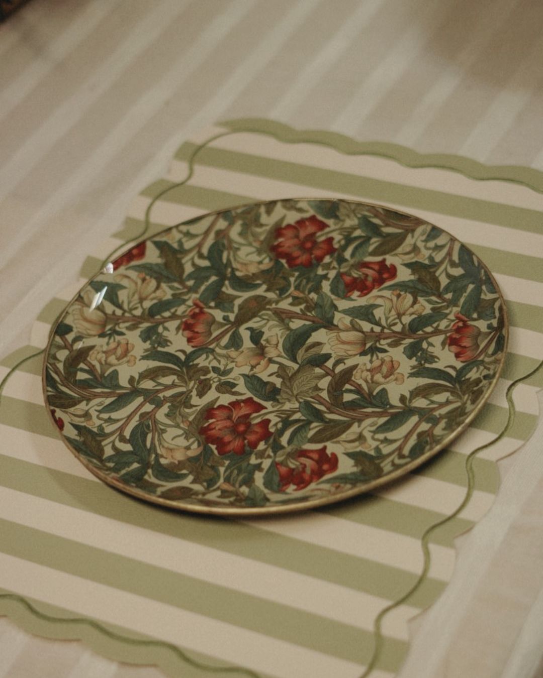 Además de su función práctica, el estampado Alicia es también un elemento decorativo que puede lucirse por sí solo en vitrinas, estanterías o mesas auxiliares, aportando un toque sofisticado y natural a cualquier espacio. Forma parte del universo de La Mela, donde la artesanía, el diseño cuidado y los detalles únicos se combinan para crear piezas con alma.
