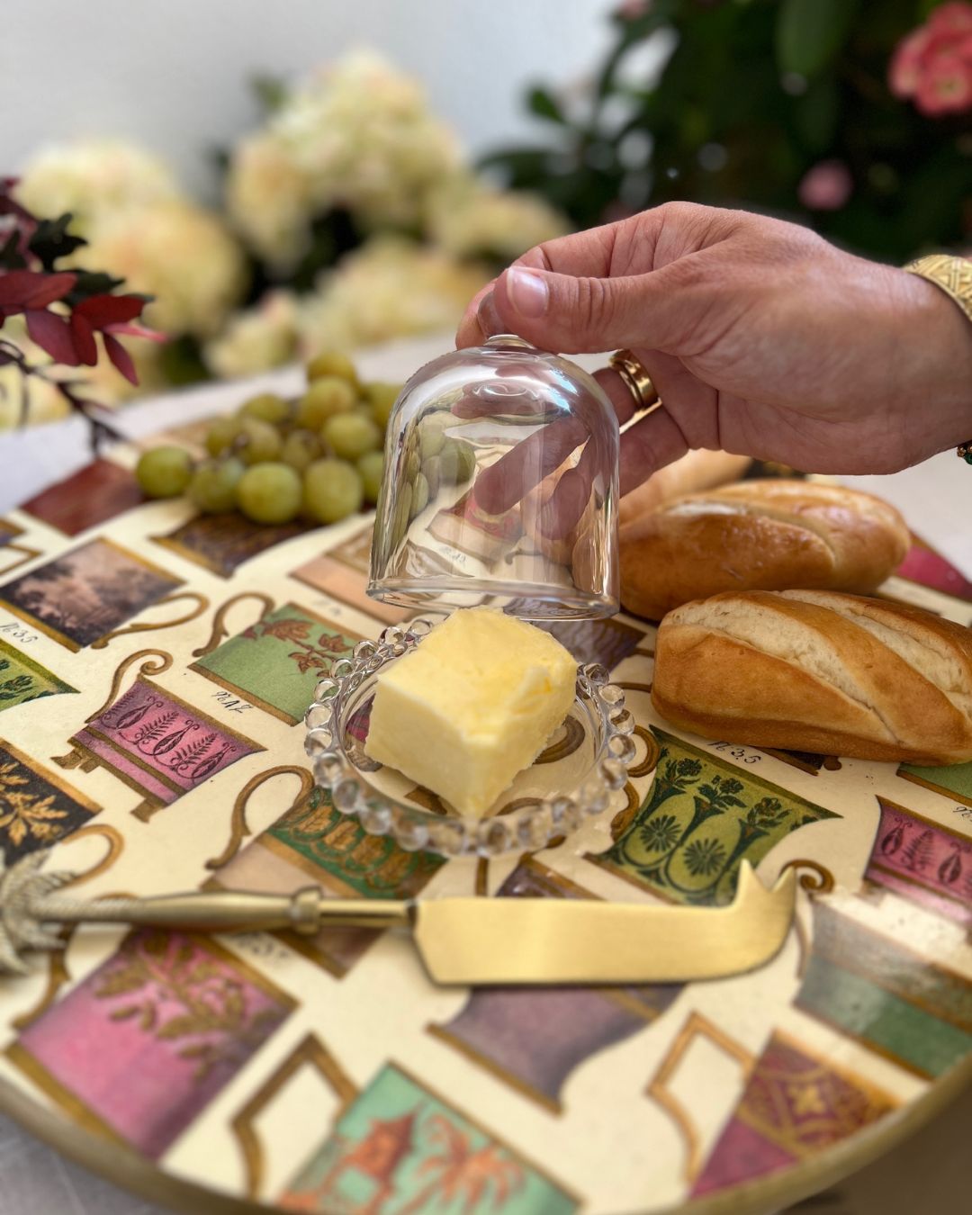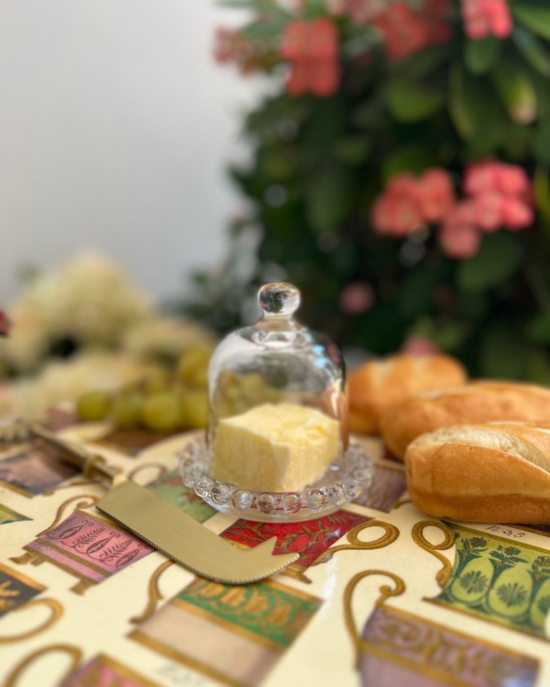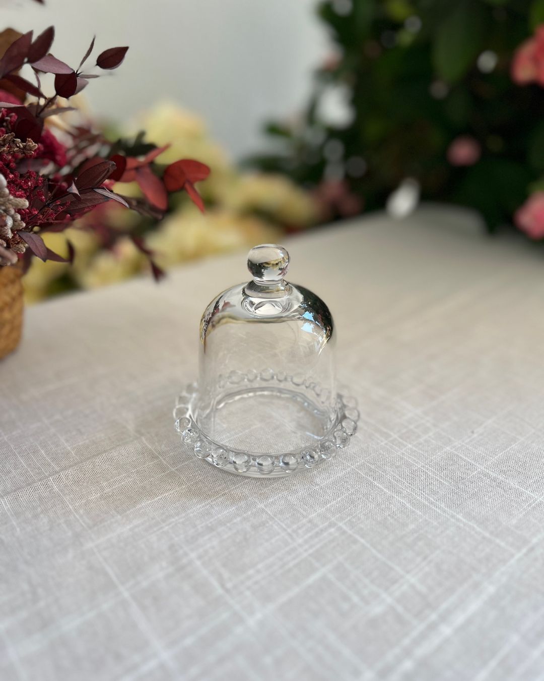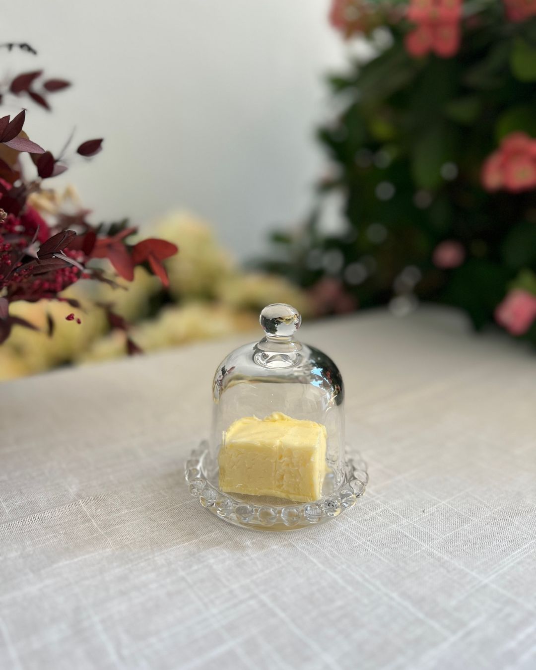 Mantequillero de cristal transparente compuesto por base decorada y campana con pomo superior. Diseñado para conservar y presentar mantequilla en la mesa o en la cocina.