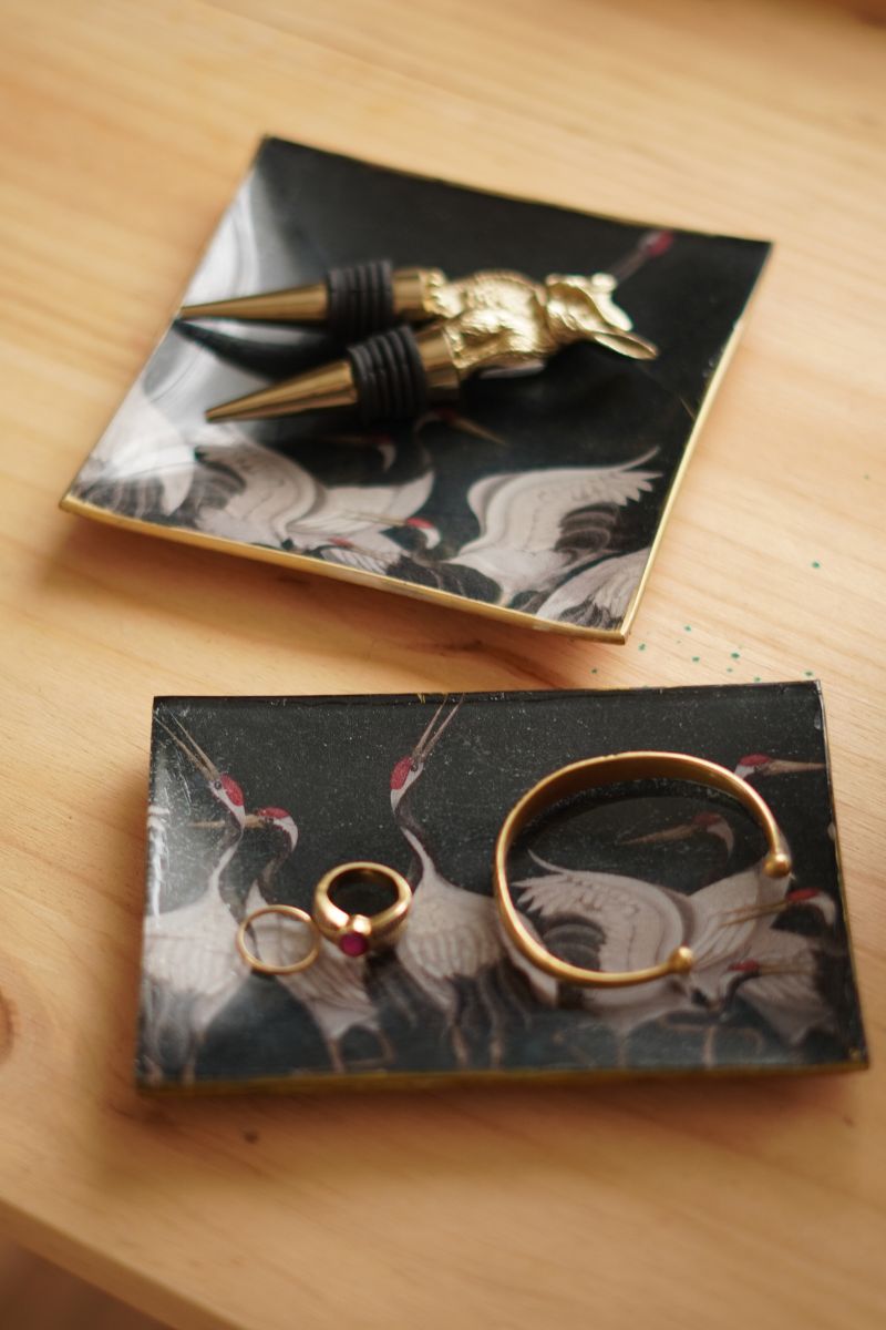 El plato se realiza mediante la técnica del decoupage, que permite integrar los diseños de manera detallada y delicada sobre la superficie. Cada pájaro se coloca con precisión, haciendo que cada plato sea único. Los detalles finos y el contraste del blanco sobre negro aportan profundidad y personalidad a la pieza, convirtiéndola en un objeto que no solo sirve para presentar alimentos, sino que también decora la mesa con estilo.