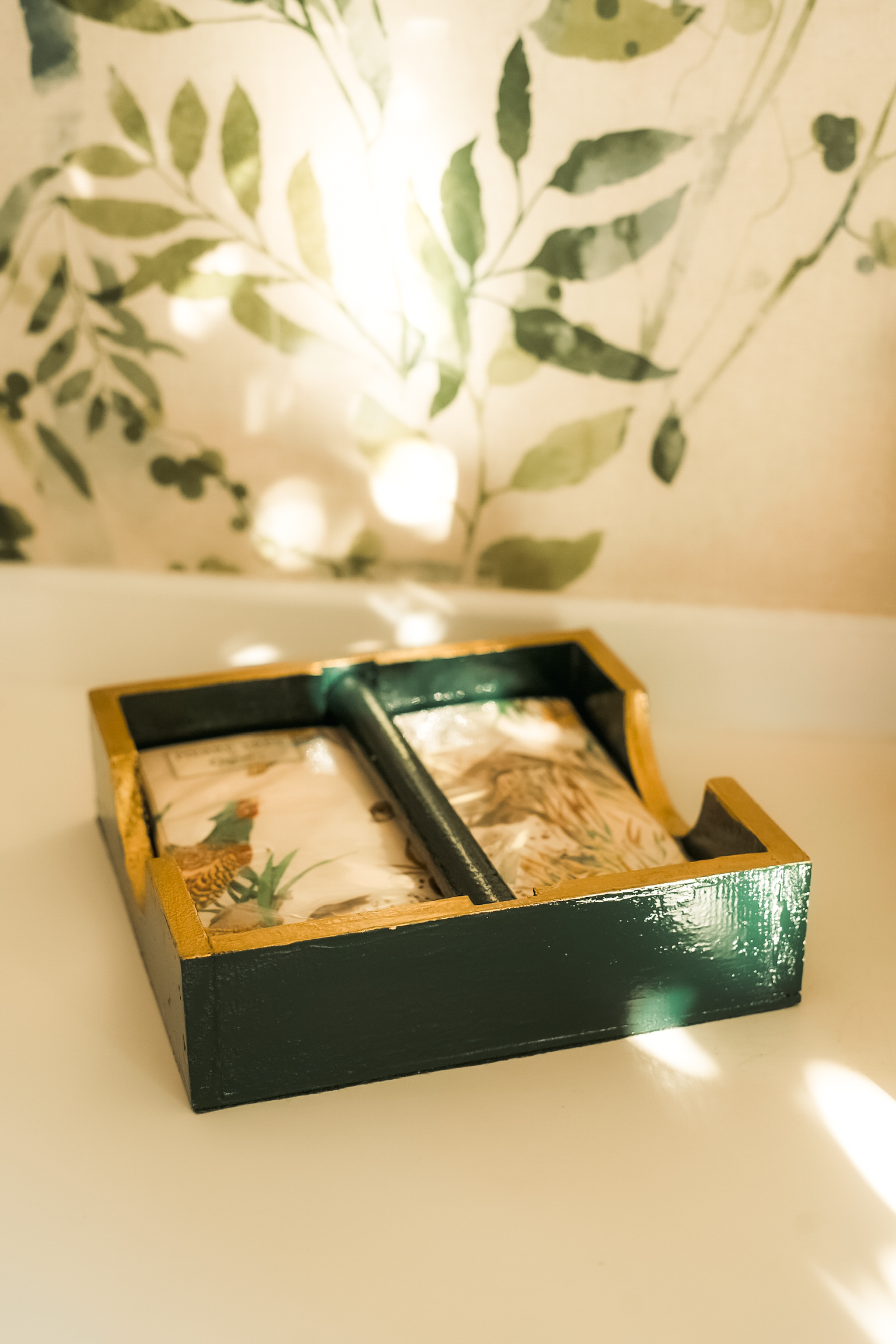 Servilleteros de madera, pintados a mano en verde carruaje con los bordes en dorado y tratados para su durabilidad. Forrados en la parte inferior con fieltro negro para la protección de sus mesas.
