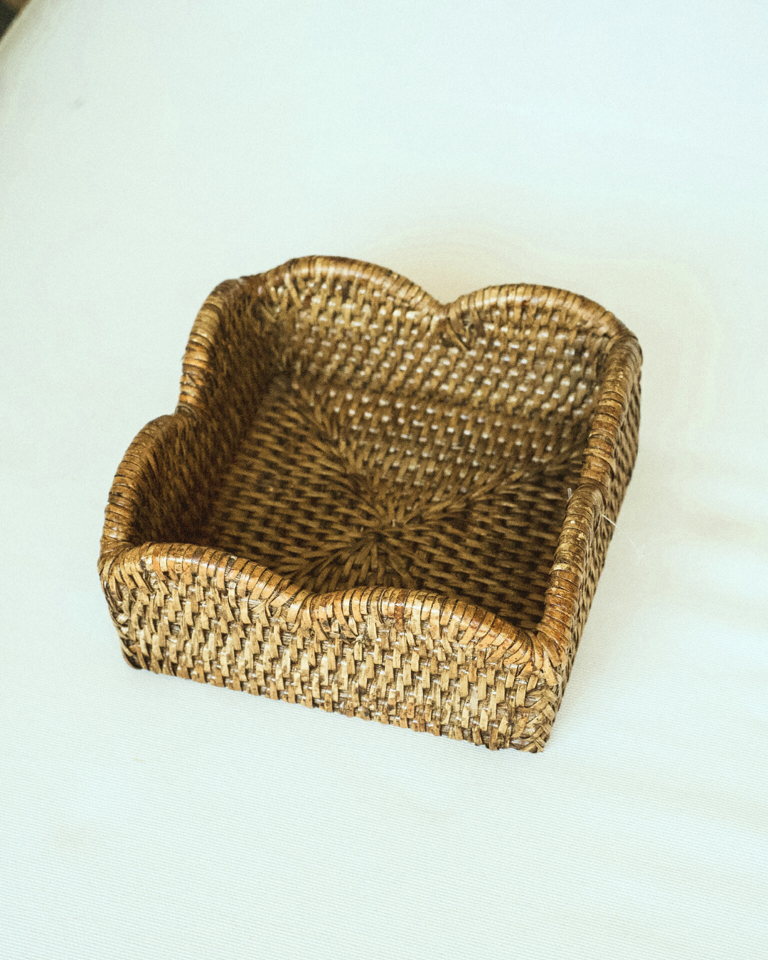 Servilletero de mimbre en formato cuadrado de 16 x 16 cm. Presenta un diseño con bordes ondulados que aporta movimiento y un detalle visual distintivo. La base está trabajada en trama radial, mientras que los laterales siguen un entramado más cerrado y vertical.